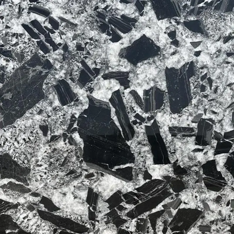 Black Patagonia Quartzite is a visually captivating natural stone, marked by its sharp contrasts and dynamic patterns. This quartzite primarily features a deep, glossy black background that is dramatically punctuated with large, irregular fragments of stark white and translucent crystal. These striking elements are bordered by fine veins that range in color from gray to almost golden, adding an intricate layer of detail to the overall appearance of the stone.